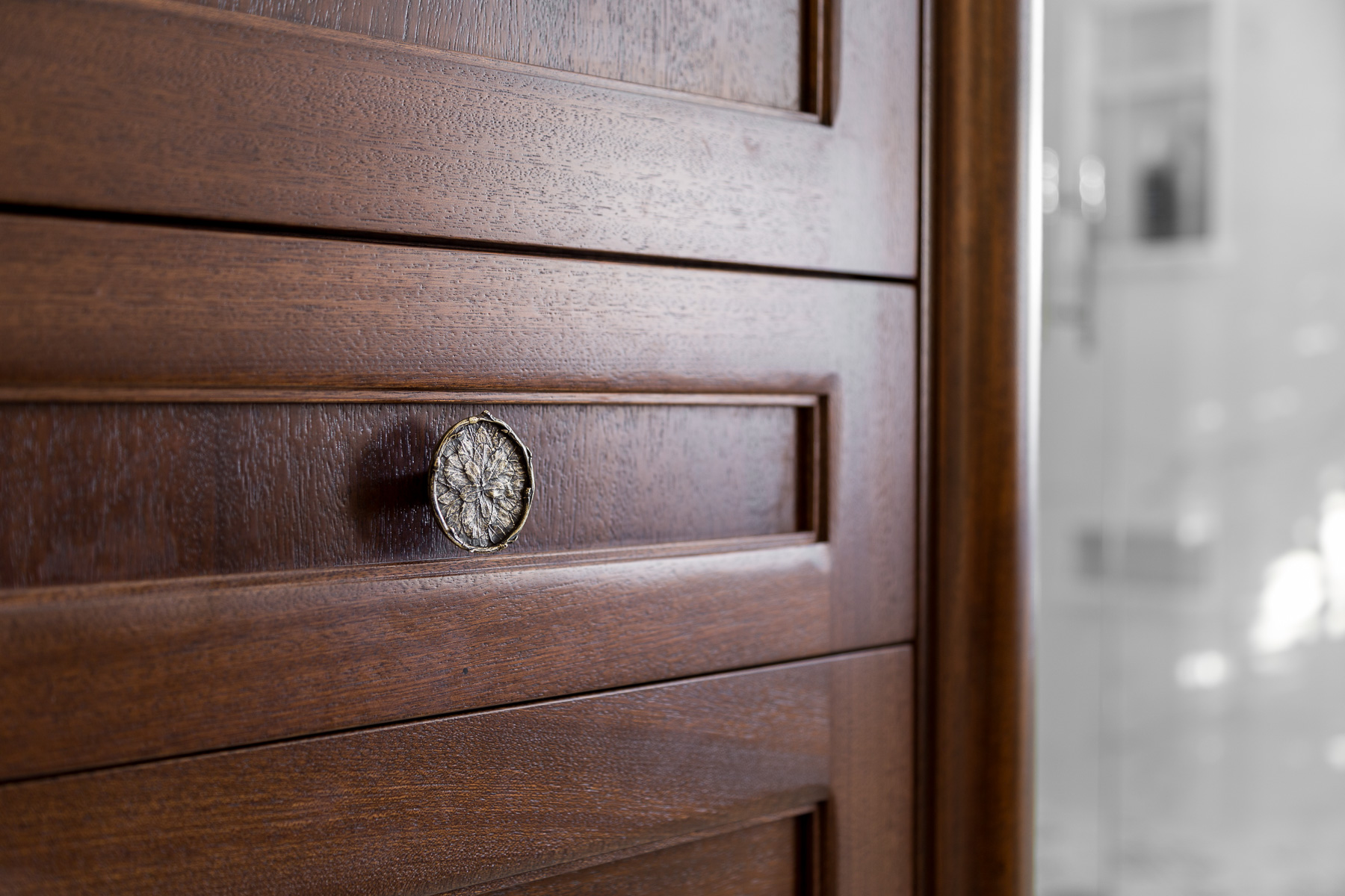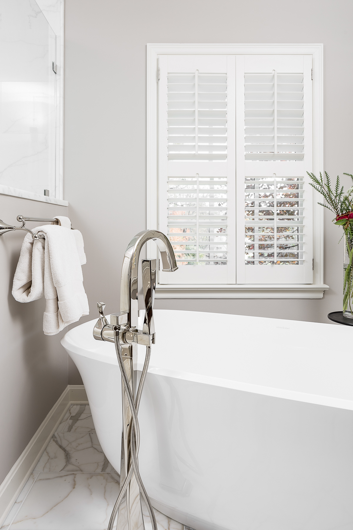 We were inspired by the smell of old wood and the feel of antiques for this gorgeous master suite remodel. Our clients have demanding careers and were looking to update their master bath to create both an inspiring place to prepare for hectic work days as well as one to unwind in at the end of the day. Luckily – we live in Louisville, Kentucky, where artisans abound. We worked closely with the craftspeople at Burkhart Company with our drawn-up cabinet designs and they helped to bring them to life. We love the attention to detail they put in all of their work. We started with the idea that the cabinets should look more like pieces of well-loved furniture that has been curated over a number of years rather than brand new pieces. We very lightly distressed the mahogany to soften the details where there would have been sharp edges otherwise. The mahogany we collectively selected for these was perfect. The graining is continuous on the flat panel vanity and the classic details of the rounded corners and legs soften the cabinetry and give it a furniture like feel. We couldn’t think of a better option than the white marble top that follows the same curves of the cabinetry below. The hardware is from Modern Objects and is antique brass with embossed leaves. The freestanding tub is from Victoria + Albert and the plumbing fixtures are from Brizo. The mosaic floor tile in the shower is from Jeffrey Court and adds to the classic element of this relaxing and elegant bathroom. The wallpaper in the toilet room is from Schumacher and is a soft blue sisal which complements the adjacent master bedroom’s light blue walls and accents. We added a soft natural wool area rug from Patterson Flynn Martin in the bedroom along with custom drapery panels with fabric from Colefax and Fowler, and custom pillows from Louisville’s pillow genius, Hollie Rich of Stuck on Hue. Who wouldn’t want to relax in this space? Ahhhhhhh…
